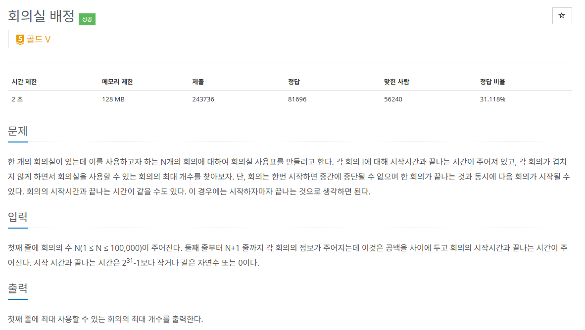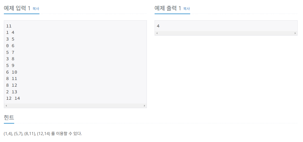 가장 빨리 끝나는 회의부터 시작해서, 이후의 회의 중 이전 회의가 끝난 후 진행할 수 있는 회의를 다음 회의로 결정한다.