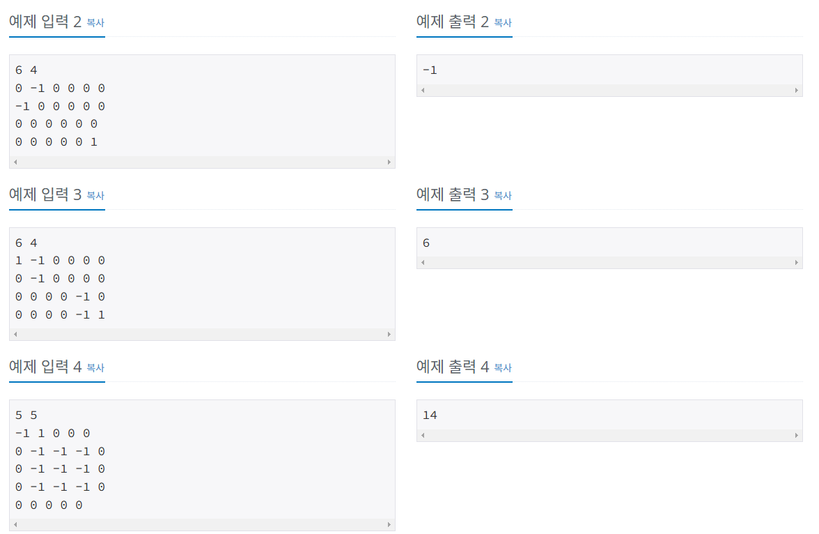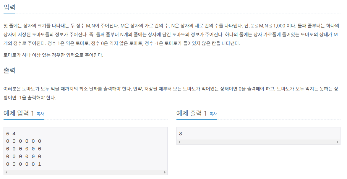 bfs가 끝난 후, 아직 안 익은 토마토가 있다면 모두 익는 것이 불가능 한 것이므로 -1을 출력한다.