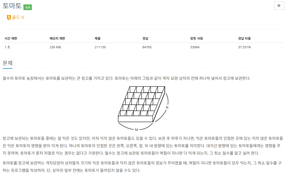 모든 익은 토마토의 좌표를 큐에 넣은 후, bfs를 실행하며 연결되어 있는 모든 토마토가 익을 때까지의 일수를 센다.