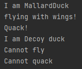 두 종류의 Duck을 생성한 후 perform 메소드를 실행하면 각각 다른 fly와 quack을 수행하는 것을 알 수 있다.