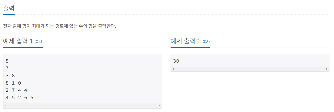 n-1번째 줄부터 자신의 아래층의 두 값중 최댓값과 자신의 값을 더해 저장한다.